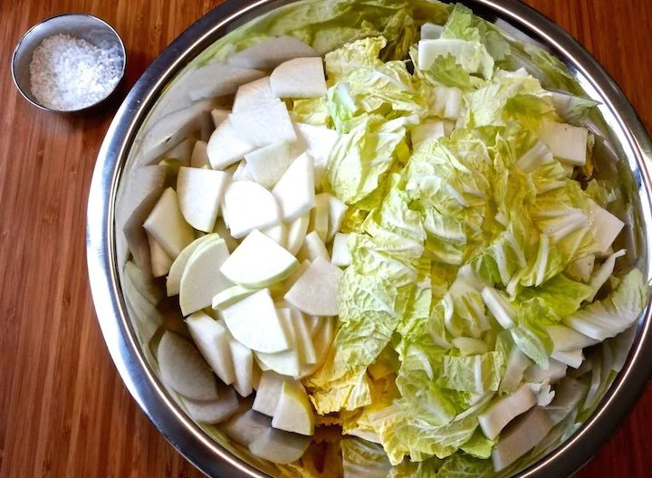 I have tried a lot of different vegetables including carrots, turnips, beets, gobo, radishes, tops of daikon/turnip/radish, kale, mizuna, watercress, green/red/savoy cabbage, shiso, cucumber, eggplant, and more. They all work well as long as the salt level is consistent and the vegetables are fresh (organic is better) so that the naturally occurring bacteria has vitality. My salt percentage is a little lower here because the anchovy sauce and salted shrimp are included. If omitting fish products, umami could be added by using shiitake, konbu, wakame, shoyu, miso, or shiokoji.